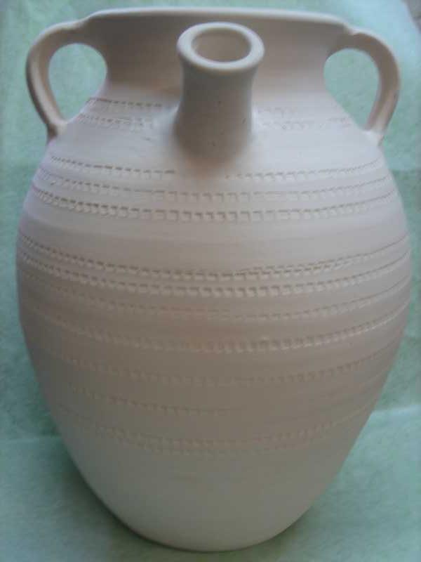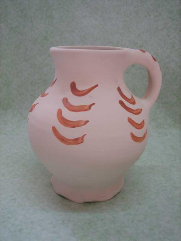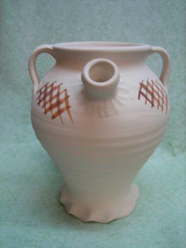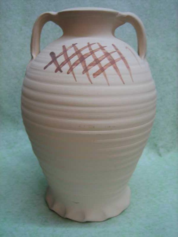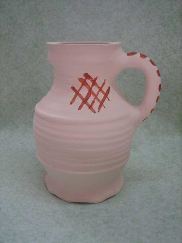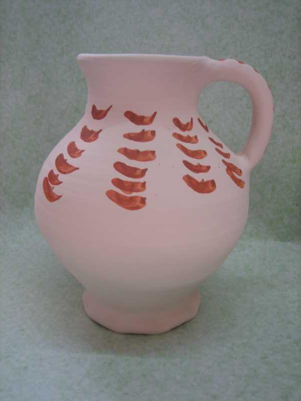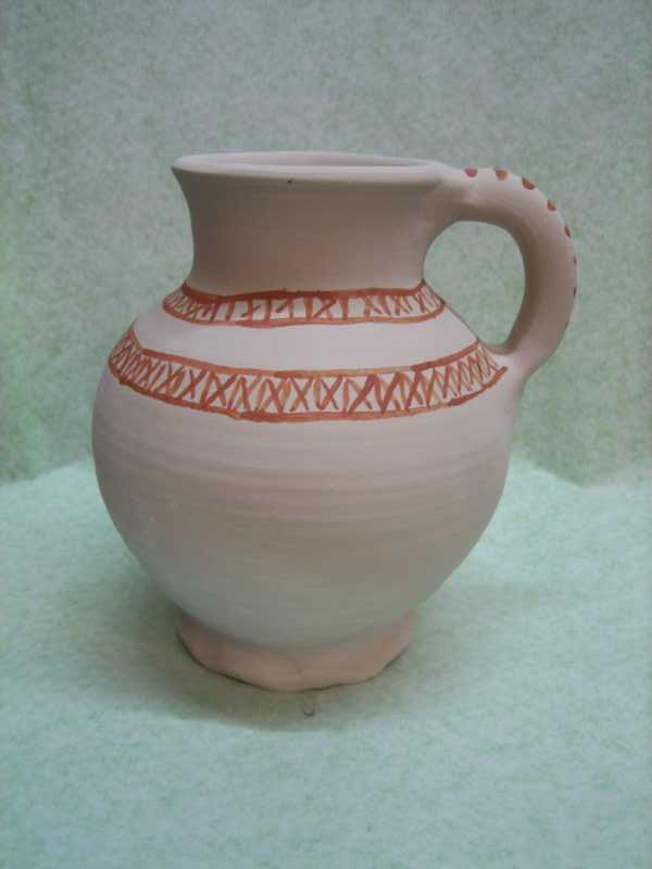 Krug mit 2 Henkeln ,unglasiert , mit Engobebemalung