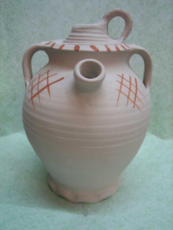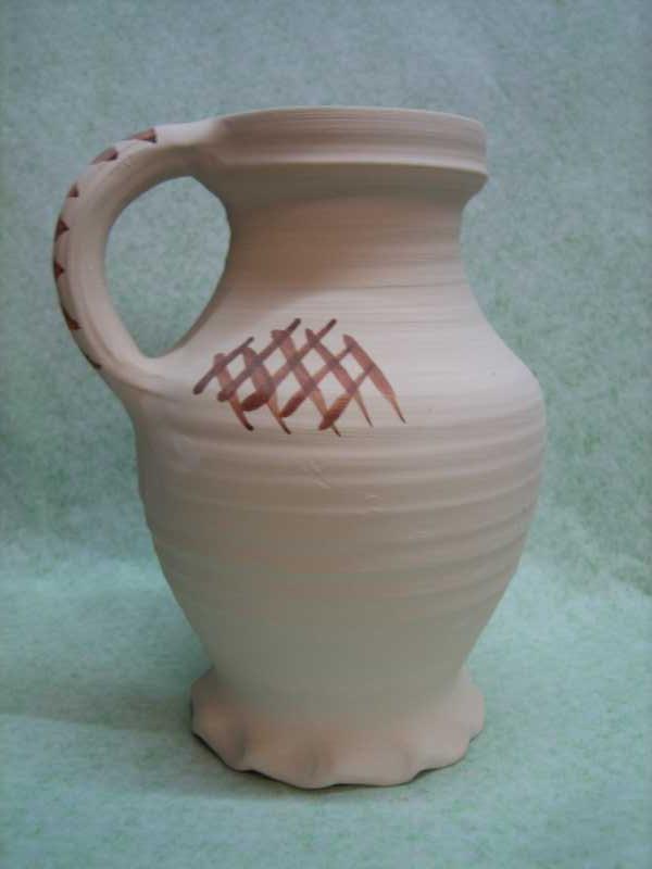 Kanne unglasiert mit Ausgusstülle ,und 2 Henkeln und Engobebemalung