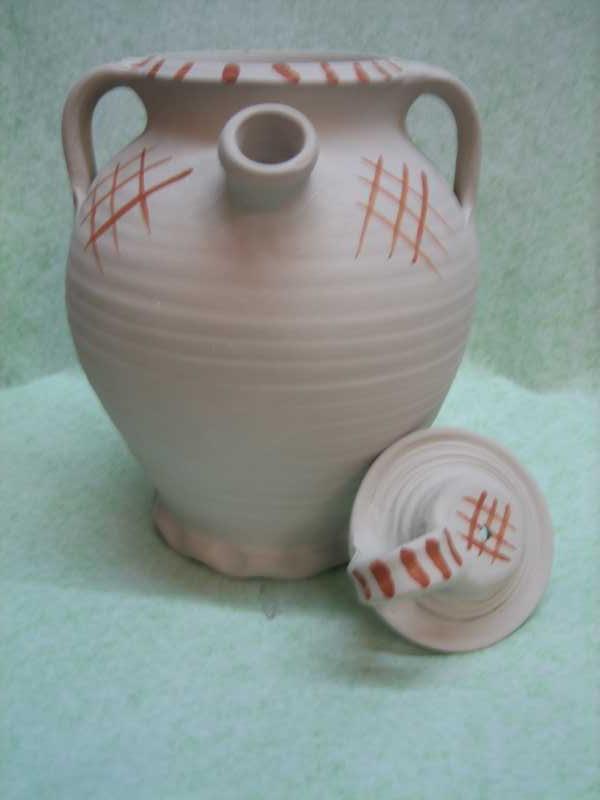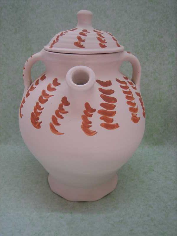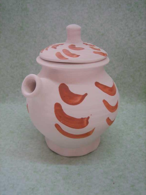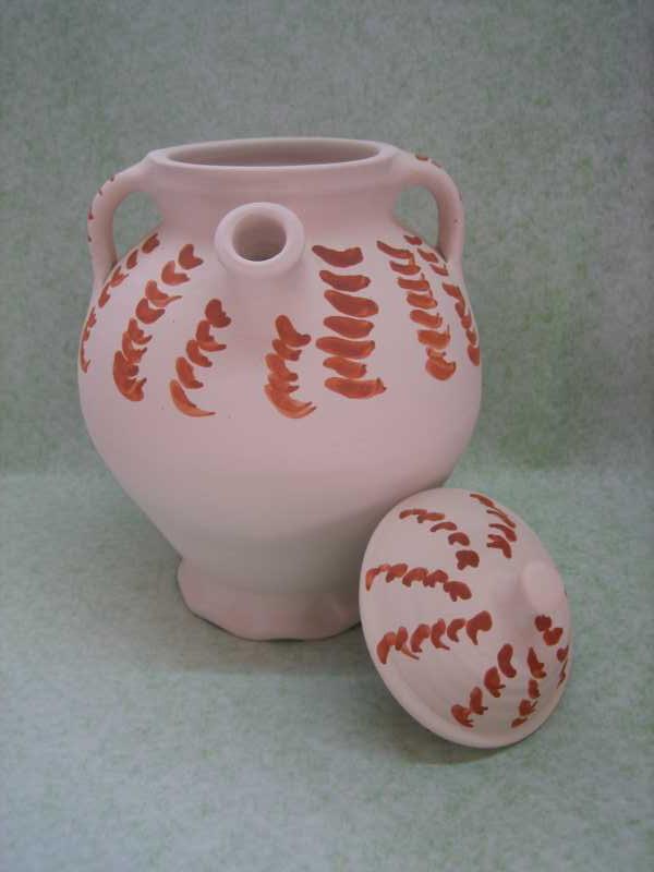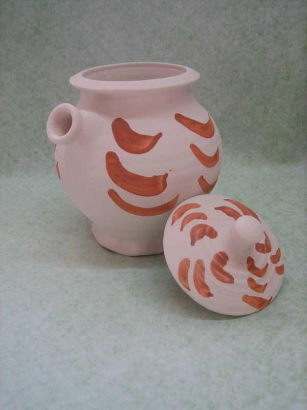 Kanne unglasiert mit Ausgusstülle, 2 Henkeln ,Deckel und Engobebemalung